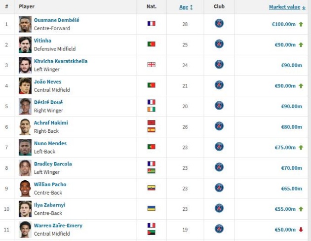 Trong khi đó, PSG tiếp tục dẫn đầu về tổng giá trị đội hình với nhiều gương mặt tăng giá. Tân binh Ilya Zabarnyi, được chiêu mộ với giá hơn 60 triệu euro, đã tăng 31% giá trị, lên 55 triệu – phản ánh tầm ảnh hưởng ngày càng lớn của anh ở hàng thủ.