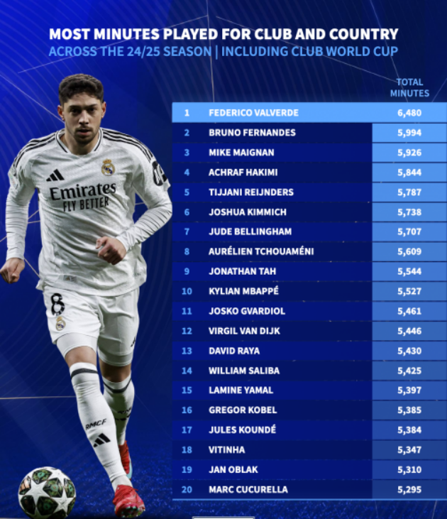 Bất ngờ lớn nhất chính là việc Federico Valverde – tiền vệ người Uruguay của Real Madrid – mới là người dẫn đầu châu Âu về tổng số phút thi đấu mùa giải 2024/25. Anh bỏ xa người xếp thứ hai gần 500 phút. Bruno Fernandes đứng thứ hai – dù Manchester United không hề góp mặt ở Club World Cup. Với fan MU, điều này có lẽ không ngạc nhiên: Fernandes luôn là “người không phổi” của Quỷ đỏ.