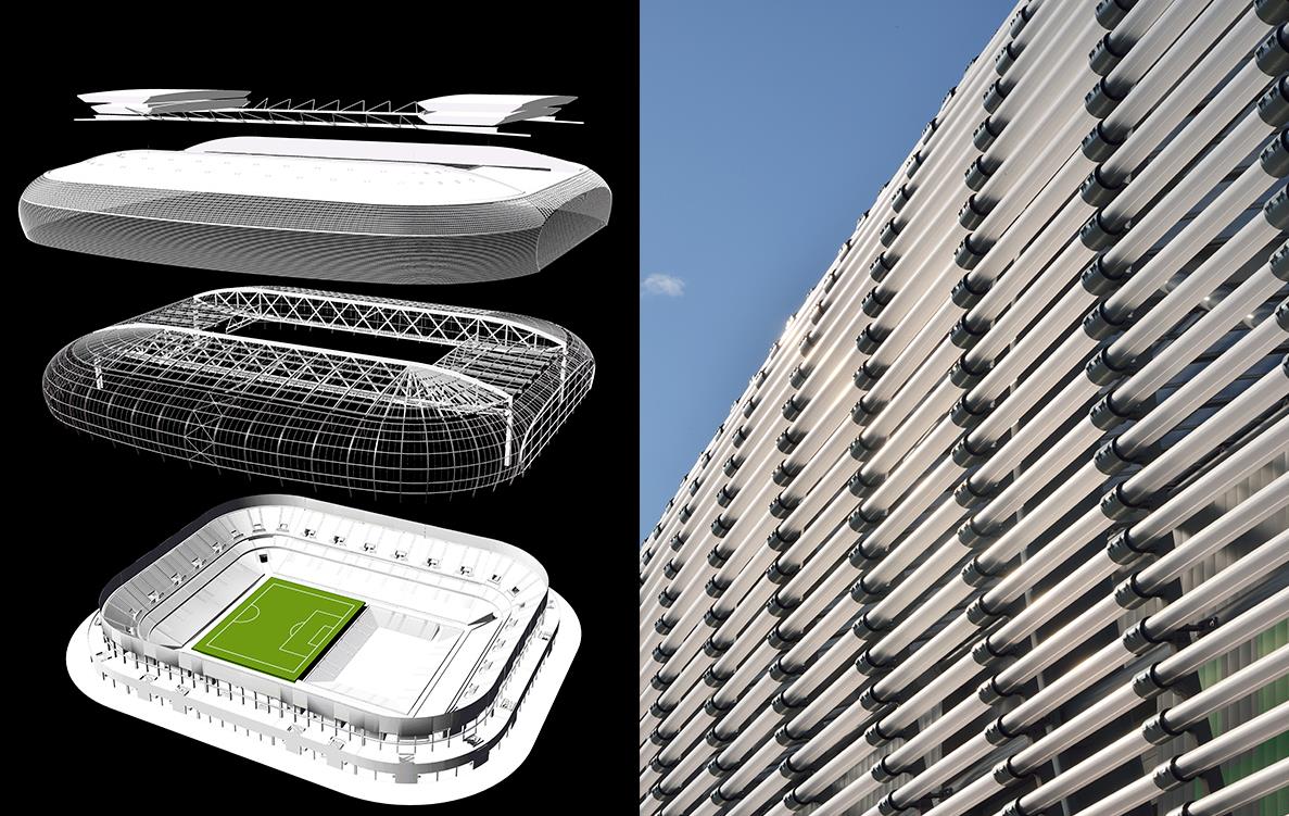 Với sức chứa tối đa 50.186 (hoặc 50.157) chỗ ngồi, sân có hình dạng như một tàu vũ trụ trong suốt, cao 31 mét. Mái che là hai phần cứng độc lập, có thể đóng mở chỉ trong 30 phút — tương tự cơ chế mái che tại University of Phoenix Stadium (Mỹ).