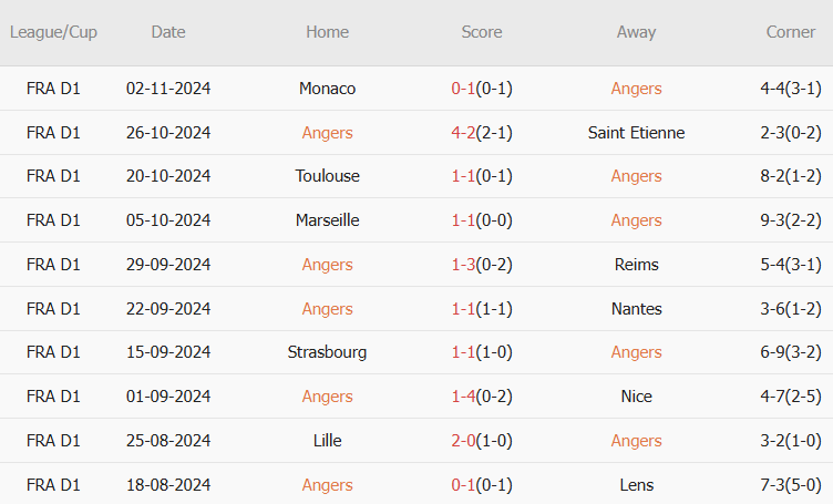 Phía bên kia chiến tuyến, Angers bước vào trận đấu với phong độ khởi sắc sau khởi đầu mùa giải khá chật vật. Mặc dù được đánh giá là ứng cử viên sáng giá cho suất xuống hạng, Angers đã chứng minh điều ngược lại khi chỉ thua 1 trong 7 trận gần nhất. Họ đã giành 8 điểm sau 4 trận gần nhất, một thành tích đầy ấn tượng và giúp họ thoát khỏi nhóm nguy hiểm. 10 trận gần nhất, Angers thắng 2, hòa 4, thua 4. Tỷ lệ chiến thắng: 20%. Tỷ lệ thắng kèo châu Á: 60%. Tỷ lệ tài: 30%.Chuỗi phong độ tốt gần đây của Angers bắt đầu bằng trận hòa đầy quả cảm trước Marseille vào tháng trước, và đặc biệt là chiến thắng sốc 3-2 trước Monaco cuối tuần qua.