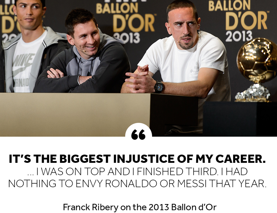 Và điều này cũng khiến Ribery đau đớn, anh cảm giác như mình bị cướp trắng danh hiệu Quả bóng vàng. Cầu thủ này nói: “Đó là sự bất công lớn nhất trong sự nghiệp của tôi. Bản thân tôi chẳng có gì để đố kỵ với Ronaldo hay Messi vào năm đó cả”.