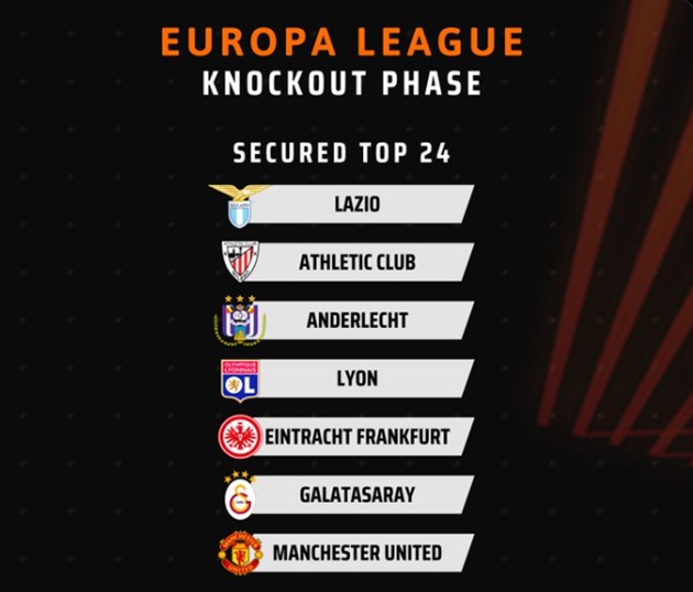 Man United đảm bảo vé vào vòng tiếp theo Europa League.Athletic Club là đội đầu tiên đảm bảo một suất vào vòng knock-out sau chiến thắng 2-0 trước Fenerbahçe ở lượt trận thứ 6.Sáu đội khác gia nhập danh sách này ngay sau đó gồm: Anderlecht, Eintracht Frankfurt, Galatasaray, Lazio, Lyon và Manchester United. Hiện tại, chưa có đội bóng nào chính thức giành quyền vào thẳng vòng 16 đội.Theo thể thức mới của Europa League, tám đội dẫn đầu bảng tổng sắp sẽ vào thẳng vòng 16 đội, trong khi các đội xếp từ vị trí thứ 9 đến 24 sẽ thi đấu play-off vòng knock-out. Đây là bước đệm để tranh vé vào vòng 16 đội.