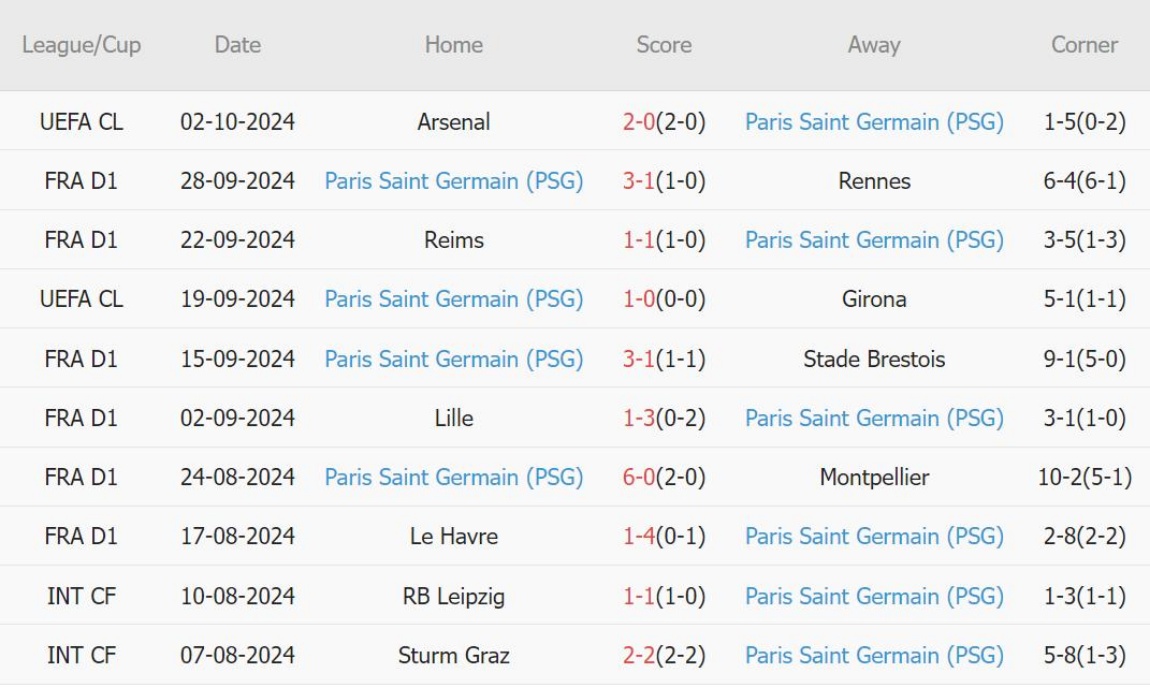 10 trận gần nhất, PSG thắng 6, hòa 3, thua 1. Tỷ lệ thắng 60%. Tỷ lệ thắng kèo châu Á 60%. Tỷ lệ tài 60%.Tại Ligue 1, PSG vẫn duy trì chuỗi trận bất bại với 5 chiến thắng và một trận hòa, giúp họ đứng đầu bảng xếp hạng. Họ đang cùng điểm với Marseille và Monaco, nhưng dẫn đầu nhờ hiệu số bàn thắng bại. Trong bối cảnh Kylian Mbappe đã chuyển đến Real Madrid, gánh nặng ghi bàn đang được đặt lên vai Bradley Barcola. Cầu thủ này đã có 6 bàn thắng sau 6 trận tại Ligue 1, sau khi chỉ ghi 5 bàn trên mọi mặt trận ở mùa trước.Ngoài Barcola, Joao Neves – một bản hợp đồng mới – cũng đang chứng tỏ giá trị của mình. Anh đã hòa nhập nhanh chóng với hàng tiền vệ của PSG, đóng góp 5 pha kiến tạo sau 6 trận đấu. Cùng với sự góp mặt của Fabian Ruiz và Warren Zaire-Emery, bộ ba này đã tạo nên một tuyến giữa vững chắc và đầy sáng tạo cho đội bóng thành Paris.10 trận gần nhất giữa 2 đội, Nice thắng 2, hòa 2, thua 6. Tỷ lệ thắng 20%. Tỷ lệ thắng kèo châu Á 60%. Tỷ lệ tài 30%.Trước cuộc đối đầu với Nice, PSG có thành tích khá tốt trên sân khách. Họ giành chiến thắng liên tiếp tại Allianz Riviera trong những lần làm khách gần đây. Điều này chắc chắn sẽ tiếp thêm tự tin cho đoàn quân của HLV Luis Enrique. Tuy nhiên, Nice, với phong độ ổn định trên sân nhà, sẽ không dễ dàng để PSG ra về với 3 điểm.Lực lượngNiceNice vẫn không có sự phục vụ của cầu thủ chạy cánh Gaetan Laborde và dự kiến sẽ phải ngồi ngoài cho đến đầu tháng 11 do bị gãy chân. Melvin Bard cũng dính chấn thương đùi.PSGGoncalo Ramos, Lucas Hernandez và Presnel Kimpembe là 3 sự vắng mặt đáng chú ý của PSG.Đội hình dự kiếnĐội hình dự kiến của hai đội. Ảnh: BongDa.com.vn.Thống kêPSG đã ghi được 70 bàn thắng vào lưới NiceCặp đấu này trung bình có 2,4 bàn thắng mỗi trậnTrận đấu gần nhất kết thúc với chiến thắng 2-1 cho PSGTỷ lệ ghi bàn & thủng lướiTỷ lệ ghi bàn và thủng lưới của hai đội 30 trận gần nhất.Tỷ lệ ghi bàn và thủng lưới của hai đội 50 trận gần nhất.Nhận địnhChỉ có được chiến thắng trước Angers và Saint-Etienne cho đến nay trong mùa giải này, Nice vẫn chưa cho thấy khả năng giành kết quả tốt trước một đội bóng hàng đầu.PSG bị tổn thương sau thất bại trước Arsenal vào đầu tuần, do đó, sẽ đáp trả bằng một chiến thắng thuyết phục tại Allianz Riviera.Dự đoán tỷ sốNice 1-3 Paris Saint-Germain (theo Sportsmole)