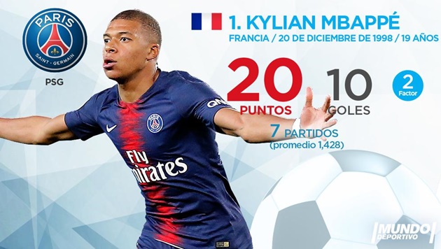 1. Kylian Mbappe: Kylian Mbappe là tài năng trẻ và trụ cột của PSG lẫn đội tuyển Pháp. Hiện tại, ngôi sao 19 tuổi đang dẫn đầu cuộc đua ”Chiếc giày vàng châu Âu” với 10 bàn thắng sau 7 lần ra sân. Số điểm quy ra của tuyển thủ số 7 là 20 điểm.