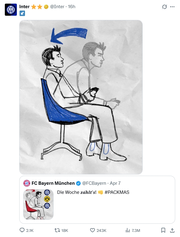 Sau trận đấu, Inter đã “trả đũa” một bài đăng trên X của Bayern Munich vào tuần trước – thời điểm trước khi vòng tứ kết diễn ra. Khi đó, phía Bayern ám chỉ rằng họ sẽ dồn toàn lực cho trận đấu với Inter sau khi hoàn tất nghĩa vụ ở Bundesliga.